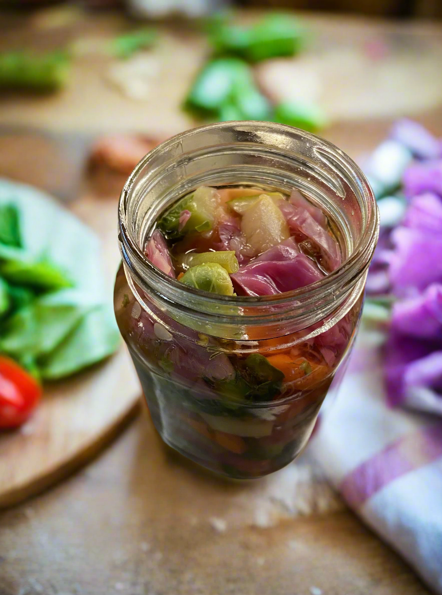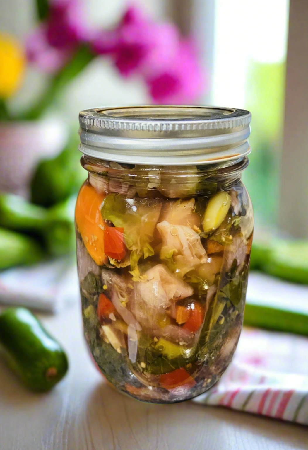 Beyond their irresistible taste, these pickled veggies offer several benefits. The vinegar in our pickling brine is known to aid in digestion, making this a delightful and health-conscious addition to your meals. The diverse array of vegetables provides a spectrum of vitamins, minerals, and fiber, contributing to a nutritious diet. From the vitamin C in bell peppers to the fiber in green beans and the various nutrients in our leafy greens, every bite is packed with natural goodness.