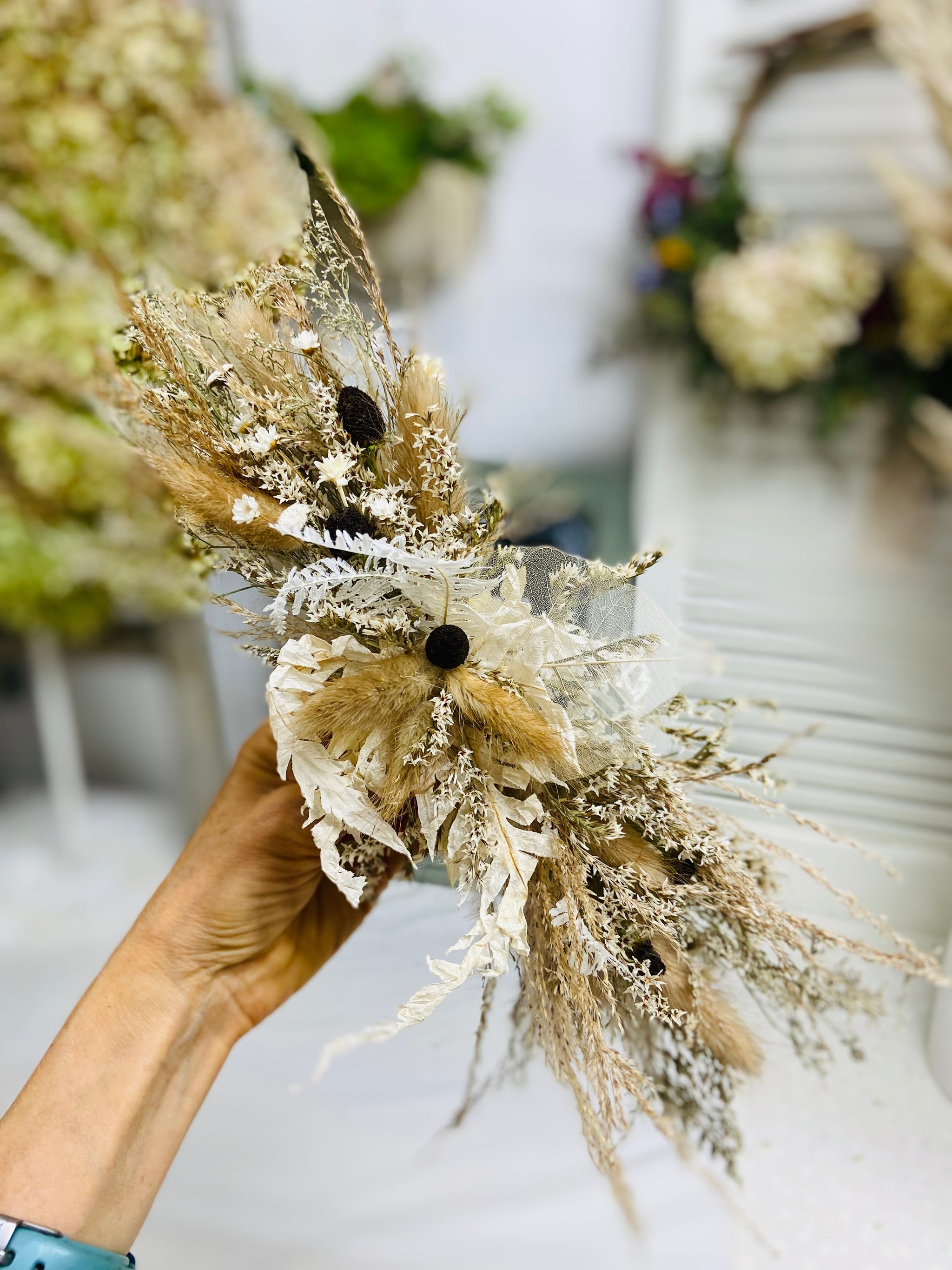 This cake topper is a beautiful arrangement of neutral colors and textures, featuring delicate plumes, intricate caspia, and unique black-eyed Susan seed pods. It is artfully accented with various bleached leaves, ferns, and bunny tails, as well as charming happy flowers, all meticulously arranged on a durable burlap back. The one pictured was made for an October 2025 wedding and is approximately 7 inches across, perfectly sized for a beautiful statement on your cake.